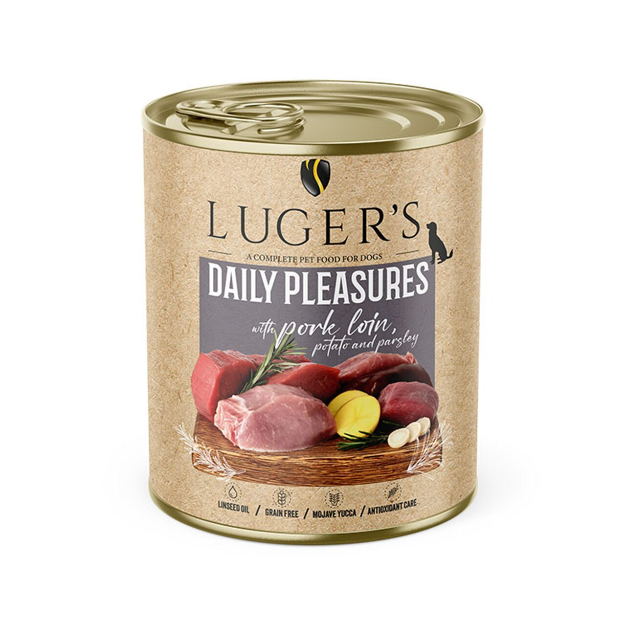Linia de hrană umedă Luger's Daily Pleasures este un produs conceput pentru hrănirea zilnică a câinilor adulți de toate rasele. Compoziția și proporțiile selectate cu precizie ale materiilor prime individuale cu cea mai mare valoare nutritivă acoperă cererea pentru toți nutrienții, ținând cont de liniile directoare nutriționale moderne. Baza formulei alimentare este carnea și organele de înaltă calitate. Datorită acestui fapt, un câine adult primește cantitatea potrivită de proteine de valoare completă, bogate în toți aminoacizii exogeni, grăsimi și, odată cu aceasta, acizii grași, atât saturați, cât și polinesaturați, și majoritatea componentelor vitaminelor și mineralelor. Adăugarea de legume asigură cantitatea necesară de carbohidrați, care garantează cursul corect al tuturor proceselor metabolice. Substanțele biologic active conținute în aditivi, precum sucul de sfeclă roșie pudră și rozmarinul, protejează împotriva efectelor negative ale stresului oxidativ și, influențând activitatea secretorie a tubului digestiv, reglează procesele digestive. Compoziția variată, prezența multor aditivi valoroși în formulă și metoda de producție asigură palatabilitatea ridicată a alimentelor Luger's Daily Pleasures.