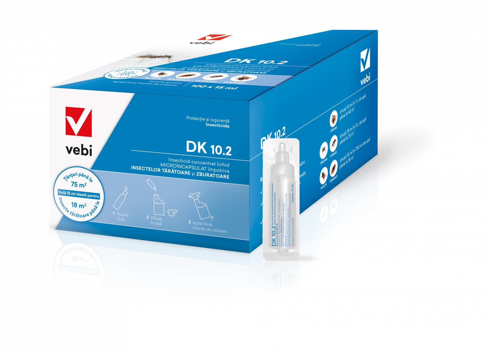 | Insecticid concentrat microîncapsulat cu acțiune imediata și acțiune reziduală COMPOZIŢIE: Cipermetrină pură 10,0 g Tetrametrină pură 2,0 g; PBO 10,0 g ŢINTĂ: Țânțari, muște, viespi, purici, căpușe, furnici, ploșnițe,gândaci, paianjeni DOZARE: Muște: 20-30 ml pe litru de soluție. Alte insecte: 5-20 ml per litru de soluție.Cu un litru de soluție tratați 30-60 m² de suprafață în funcție de porozitatea materialului INSTRUMENTE DE UTILIZARE: Nebulizatoare ULV ; Pompe și pompe de umăr |
