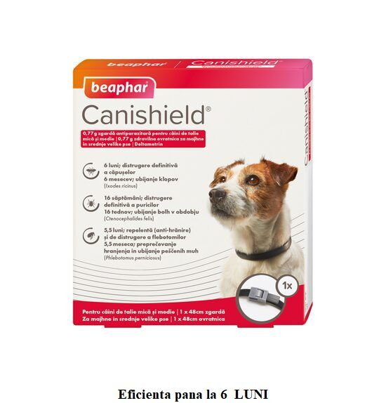Beaphar CaniShield este sigură pentru câinii cu vârsta peste 7 săptămâni. Substanța activă deltametrin se eliberează treptat și este distribuită prin stratul de grăsime de pe pielea câinelui. În cazuri rare, poate apărea iritație locală sau reacții gastrointestinale ușoare, dar acestea dispar în 48 de ore după îndepărtarea gulerului. Zgarda nu se folosește la pisici și nu trebuie aplicată pe câinii cu hipersensibilitate la deltametrin. Potrivită pentru câinii de talie mare.